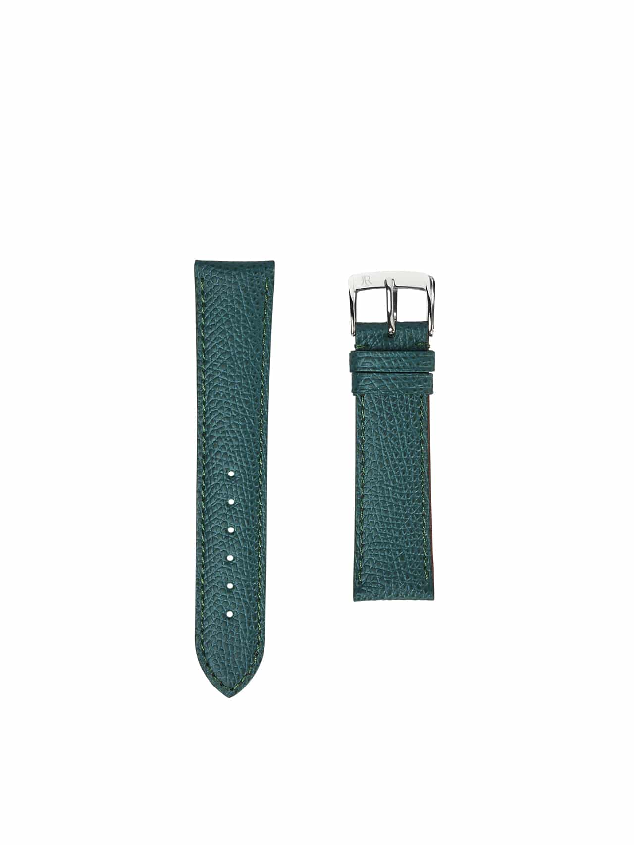 Calfskin is available embossed with different grain patterns such as “Soja” or “Dolphin.” These different textures add interest and an appealing, understated look to the surface of these calfskin straps and leather goods.