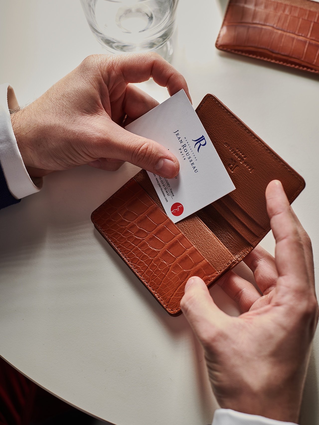 This business card holder can store business cards in a large storage space. In addition, ID cards and credit cards can also be inserted (with 3 card slots). This product is lined with goat leather and handcrafted by the artisans of the Manufacture Jean Rousseau.