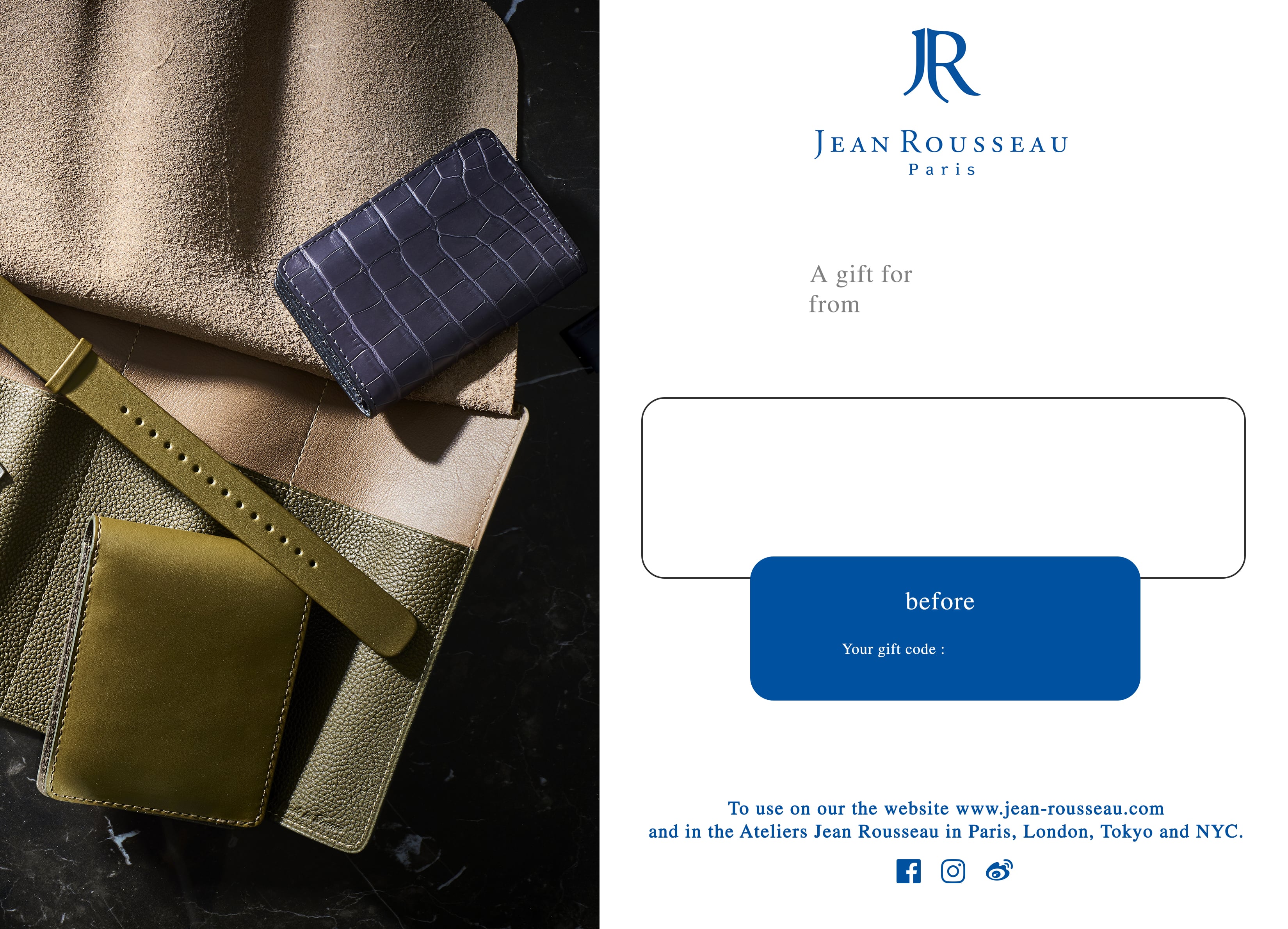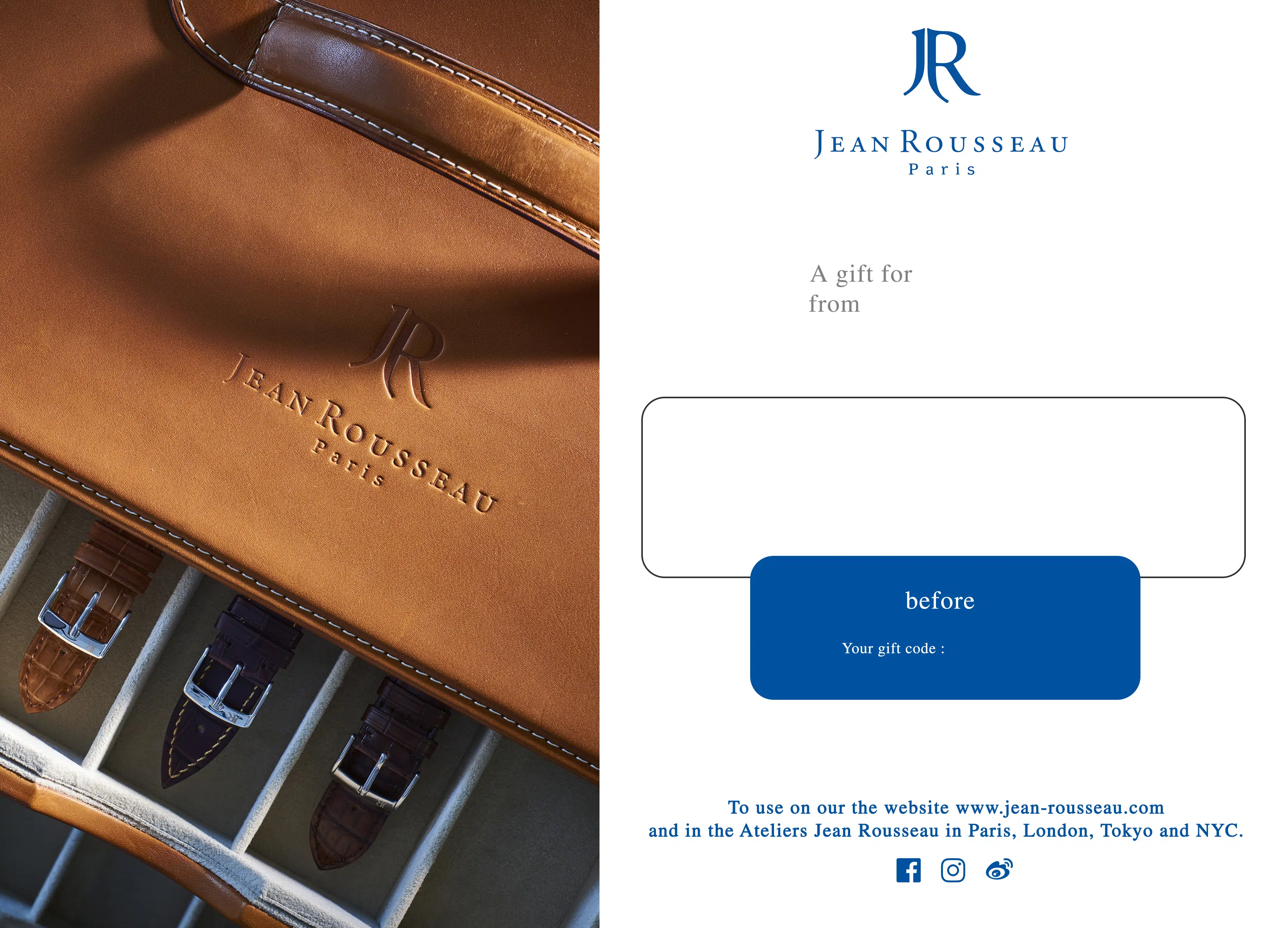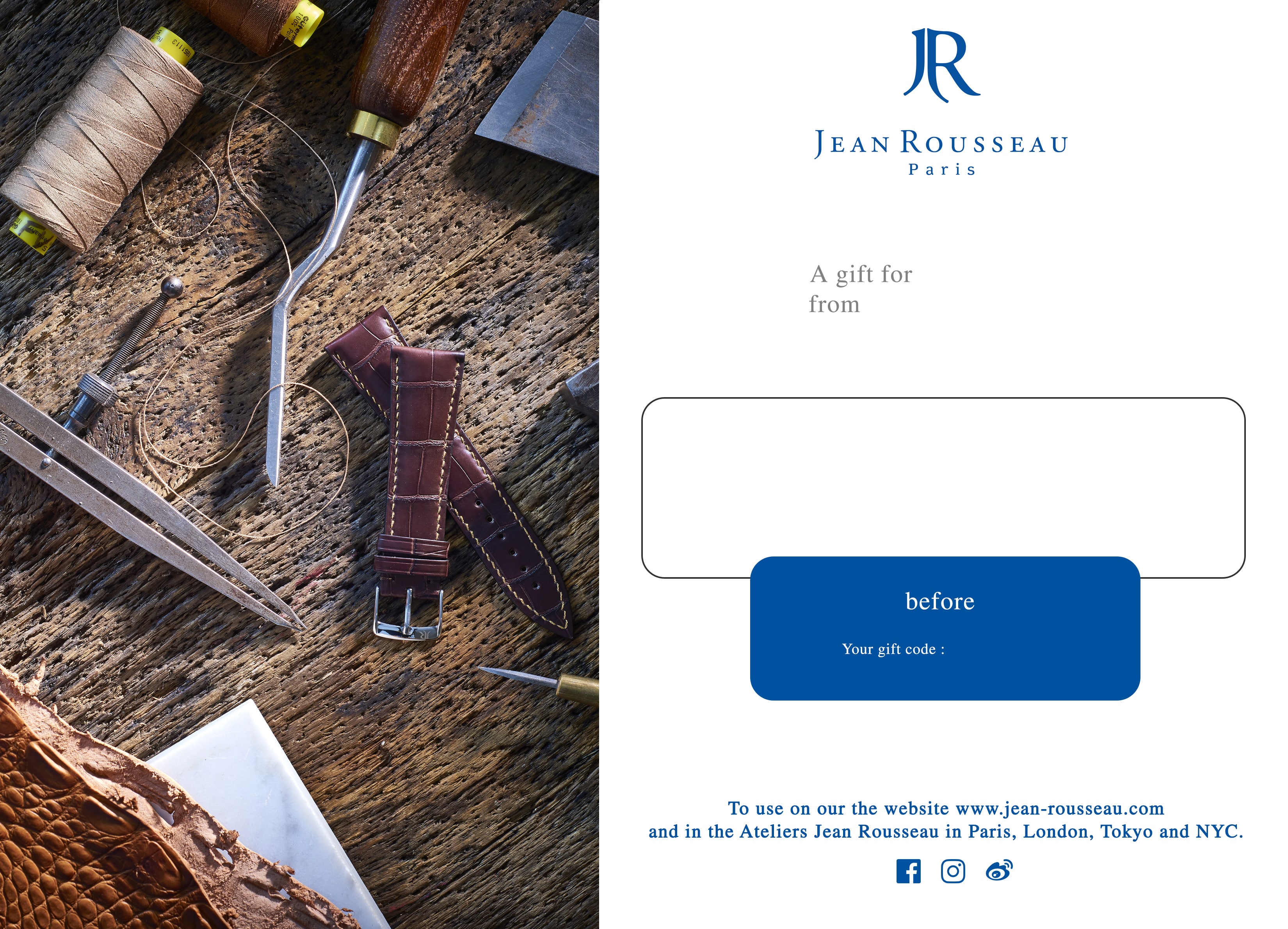 The best gift is the one you can personalize! Let your loved one order a bespoke watch strap* in calfskin and later select his/her favorite colors for its lining, the stitching and maybe add his/her initials. This gift card can be used in our four Ateliers-boutiques in Paris, London, Tokyo and NYC or on our website (e-shop and bespoke orders). *depending on the exact type of strap needed, the price may be adjusted in store. Alligator flank linings and the option of hand stitching with gold or platinum thread are not included in this offer. Spare watch parts and proprietary components (inserts, buckles, etc.) cannot be supplied