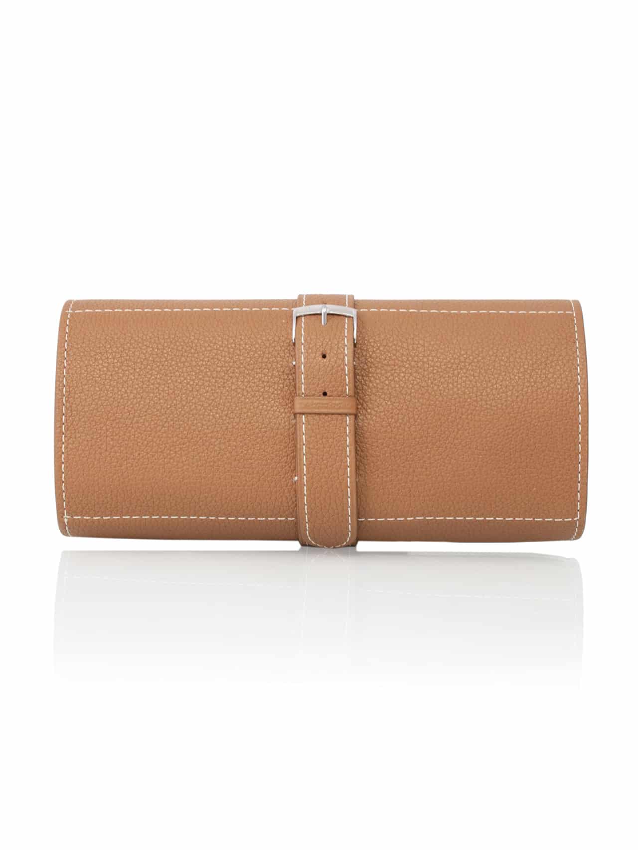 Calfskin is available embossed with different grain patterns such as “Soja” or “Dolphin.” These different textures add interest and an appealing, understated look to the surface of these calfskin straps and leather goods.